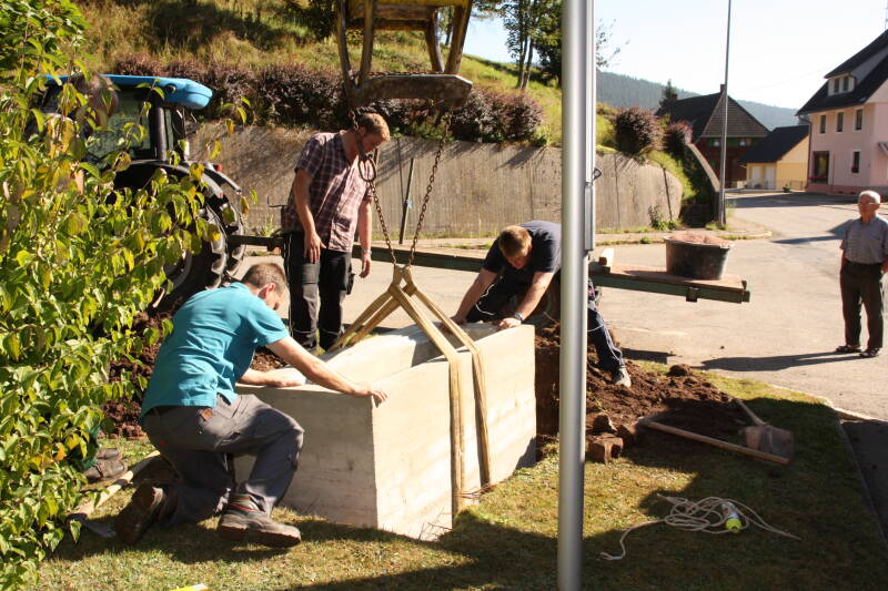 Am 08.09.2012 waren die Männer der Burgzunft sehr gefragt. Der Platz beim Narrenbrunnen sollte nämlich ab der kommenden Fasnet verstärkt ins Licht des närrischen Spektakels gerückt werden. Der bisherige Stellplatz stand nicht mehr zur Verfügung und so galt es einen neuen Platz zu finden. Dieser sollte genügend Fläche für die Feierlichkeiten bieten sowie auf städtischem Gelände liegen. So wurde es der jetzige Standort in unmittelbarer Nähe zum Narrenbrunnen. Baumrat Albert Willmann übernahm mit seinen Söhnen die Fertigung des Fundaments, das künftig für die Stabilität des Narrenbaums sorgen soll. Der Sockel, der nach den Plänen von Hermann Demattio angefertigt wurde, wiegt ganze zwei Tonnen und wurde an diesem Samstag in der Erde versenkt.